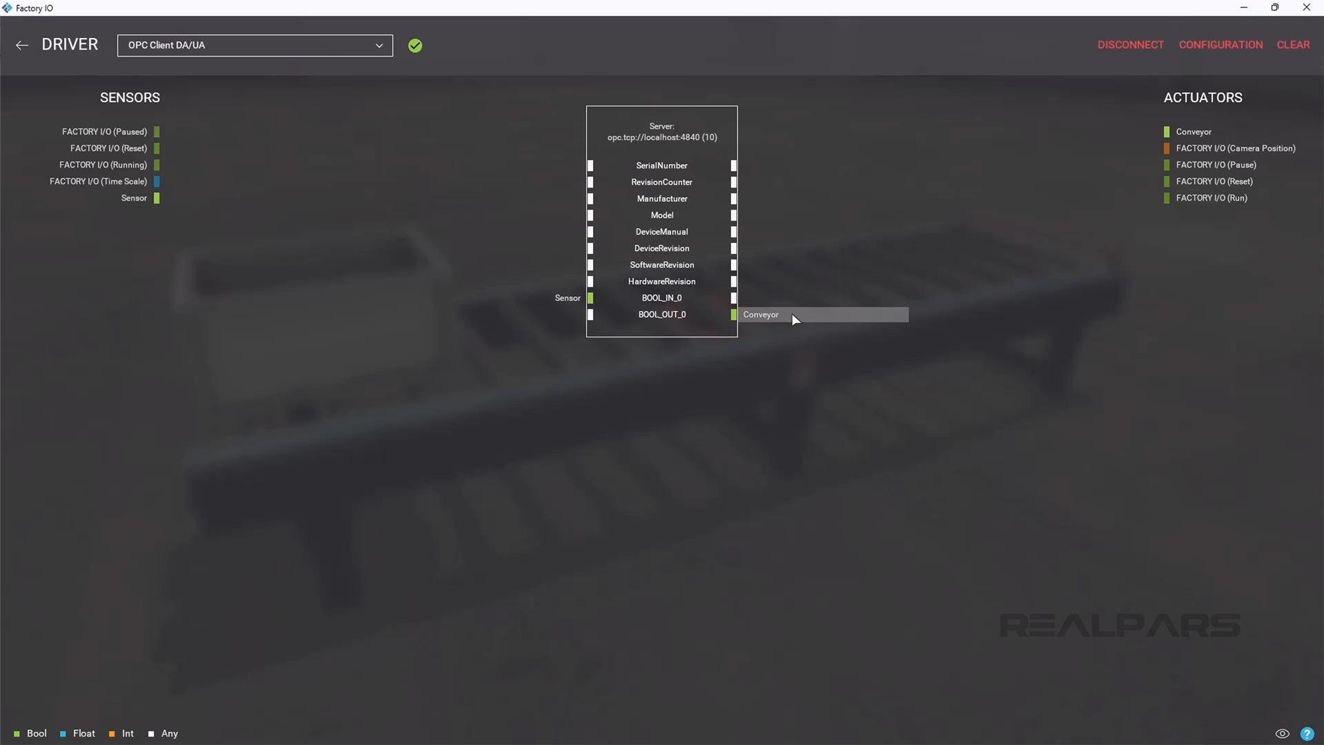 In the Driver dropdown, select OPC Client DA/UA to specify that we want Factory IO to act as an OPC UA client.