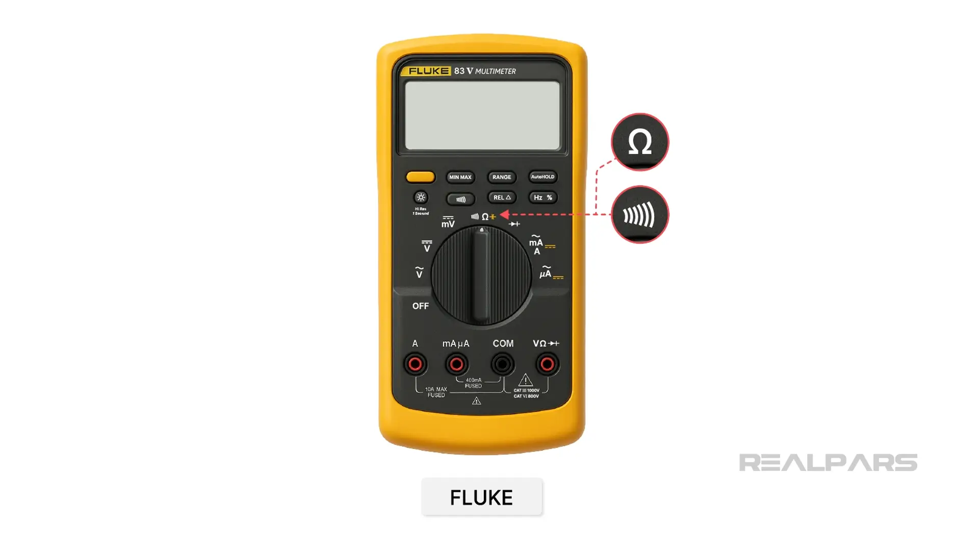The Continuity multimeter position symbol varies by vendor, but you’ll likely see the sound wave symbol used more than others. For example, the Fluke 83 DMM uses a sound wave symbol.