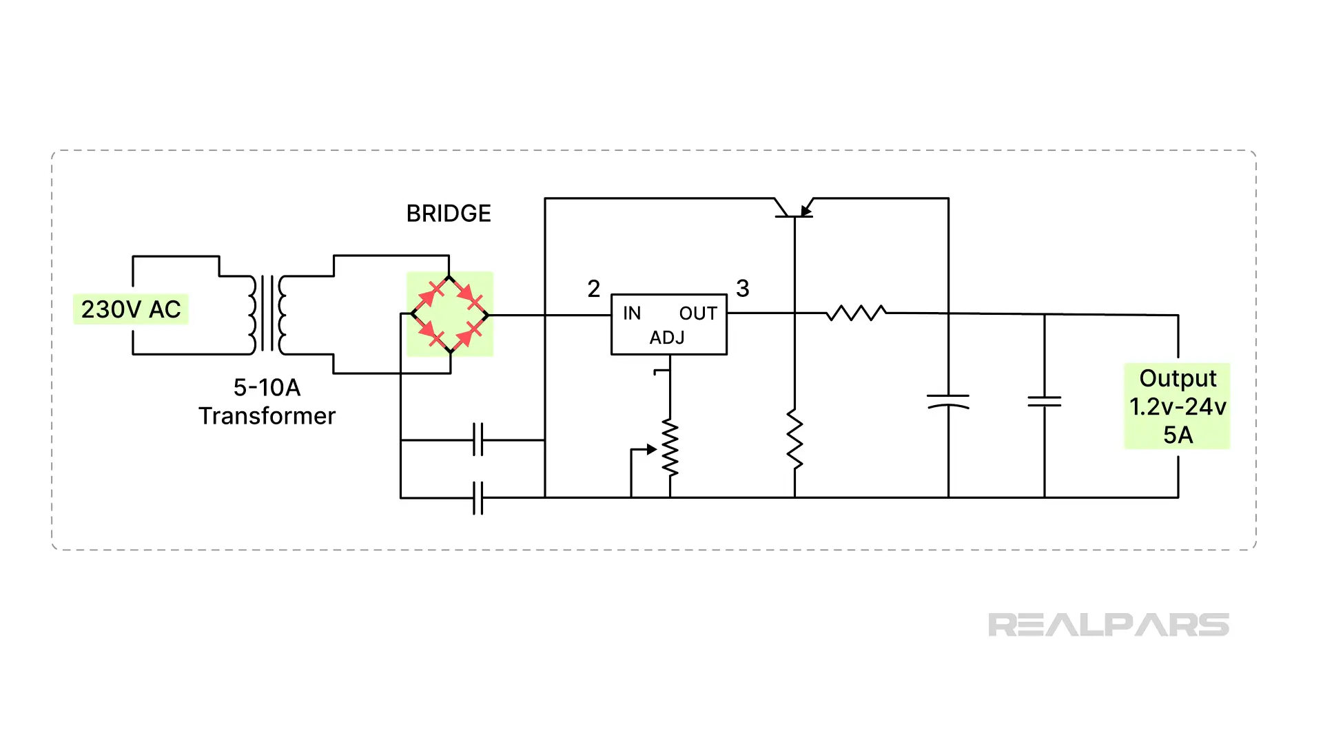 Diodes are used in DC power supplies as rectifiers to convert AC to DC voltages. A common bridge rectifier consists of four diodes.