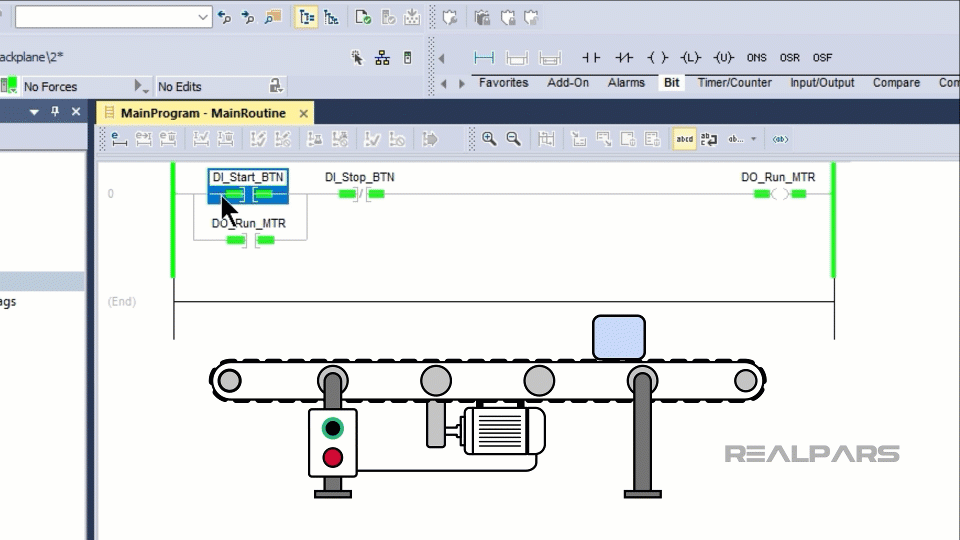 When the start button is pressed, the output DO_Run_MTR turns on and the conveyor starts running. When the start button is released, the conveyor continues to run because the output DO_Run_MTR is sealed in by the branch that goes around the permissive.