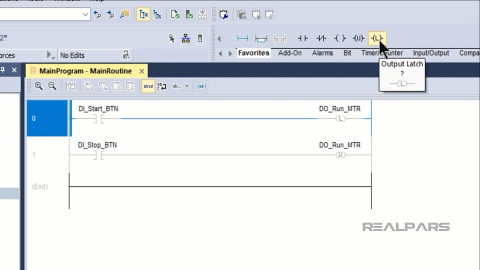 In this example, the Output Latch instruction latches the output DO_Run_MTR to true when the start button is pressed.
