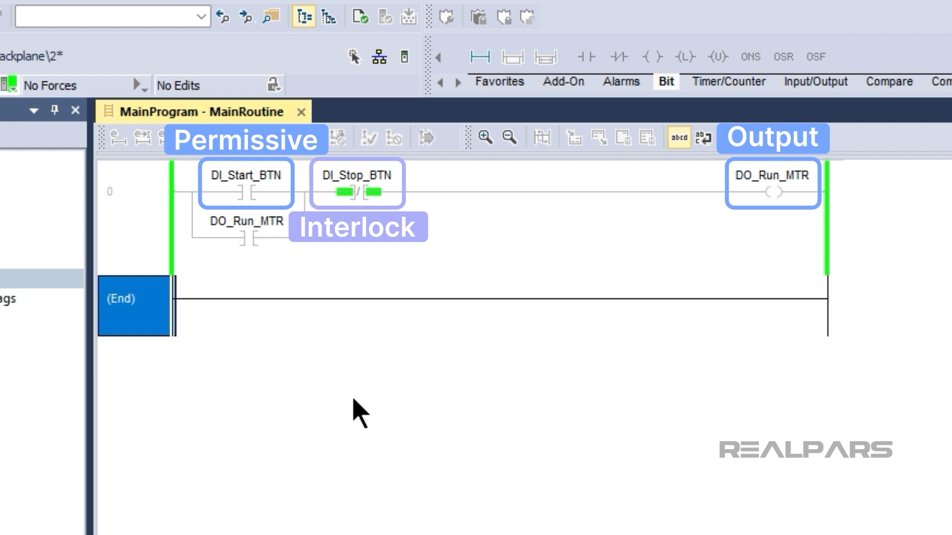 An interlock is a condition that must be true for the output to be on. In this case, the input DI_Stop_BTN is an interlock. If the stop button is pressed, the seal-in circuit is unsealed, the output DO_Run_MTR becomes false and the conveyor stops running.