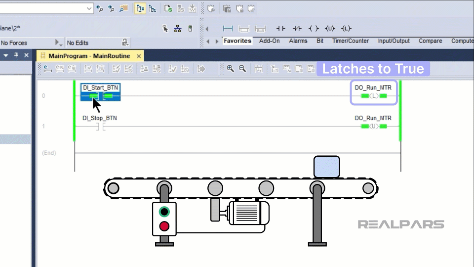 Imagine if the conveyor in our example were running and the PLC lost power. When power to the PLC was restored, the conveyor would immediately start running again because the output to run the conveyor is still latched to true.